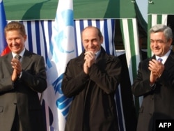 Armenia -- Serzh Sarkisian (R), Robert Kocharian (C) and Russian Gazprom head Aleksei Miller at a gas pipeline laying ceremony in Ararat, 01Dec2008