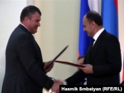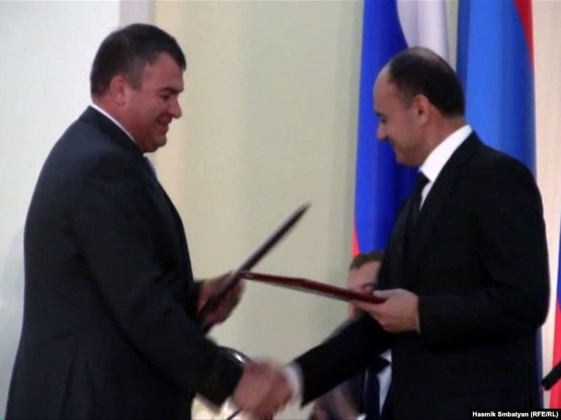 Министр обороны России Анатолий Сердюков и министр обороны Армении Сейран Оганян после подписания протокола о российской военной базе на территории Армении. Ереван, 20 августа 2010 г.