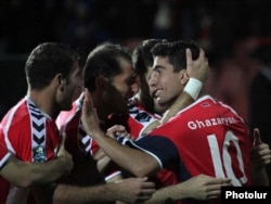 Armenia -- National football team players celebrate after scoring a goal against Slovaki in a Euro 2012 qualifier, Yerevan, 08Oct2010