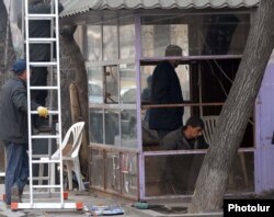 Armenia - Workers dismantle a kiosk in Yerevan.