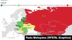 Արևելյան ու Կենրոնական Եվրոպան, Ռուսաստանը, Հարավային Կովկասն ու Կենտրոնական Ասիան ընդգրկող 29 երկրներից 8-ը՝ Ռուսաստանը, Բելառուսը, Ադրբեջանը, Կենտրոնական Ասիայի 5 երկրները համարվել են կոնսոլիդացված ավտոկրատիայի երկրներ։