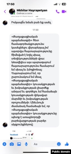 Համարձակ ու անկաշկանդ հարցազրույցից մի քանի ժամ անց նույն Ասլանյանի ֆեյսբուքյան էջում հայտնվեց զղջման տեքստ, որ իր խոսքերը էմոցիոնալ ու սխալ տեղեկությունների հիման վրա են եղել, ինքը ցանկանում է մնալ «Քաղաքացիական պայմանագրում»։