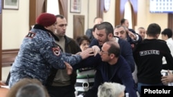 Վեճ, քաշքշուկ՝ իշխող ՔՊ-ի և ընդդիմադիր «Մայր Հայաստան»-ի միջև, ընդմիջումից հետո կարմիր բերետավորների մուտքն էլ ավելի թեժացրեց իրավիճակը։ Իրավապահները ուժով դուրս հանեցին քաղաքապետ Տիգրան Ավինյանի հետ լեզվակռվի բռնված «Մայր Հայաստան»-ի անդամ Սամվել Հակոբյանին և թիմակիցներին։